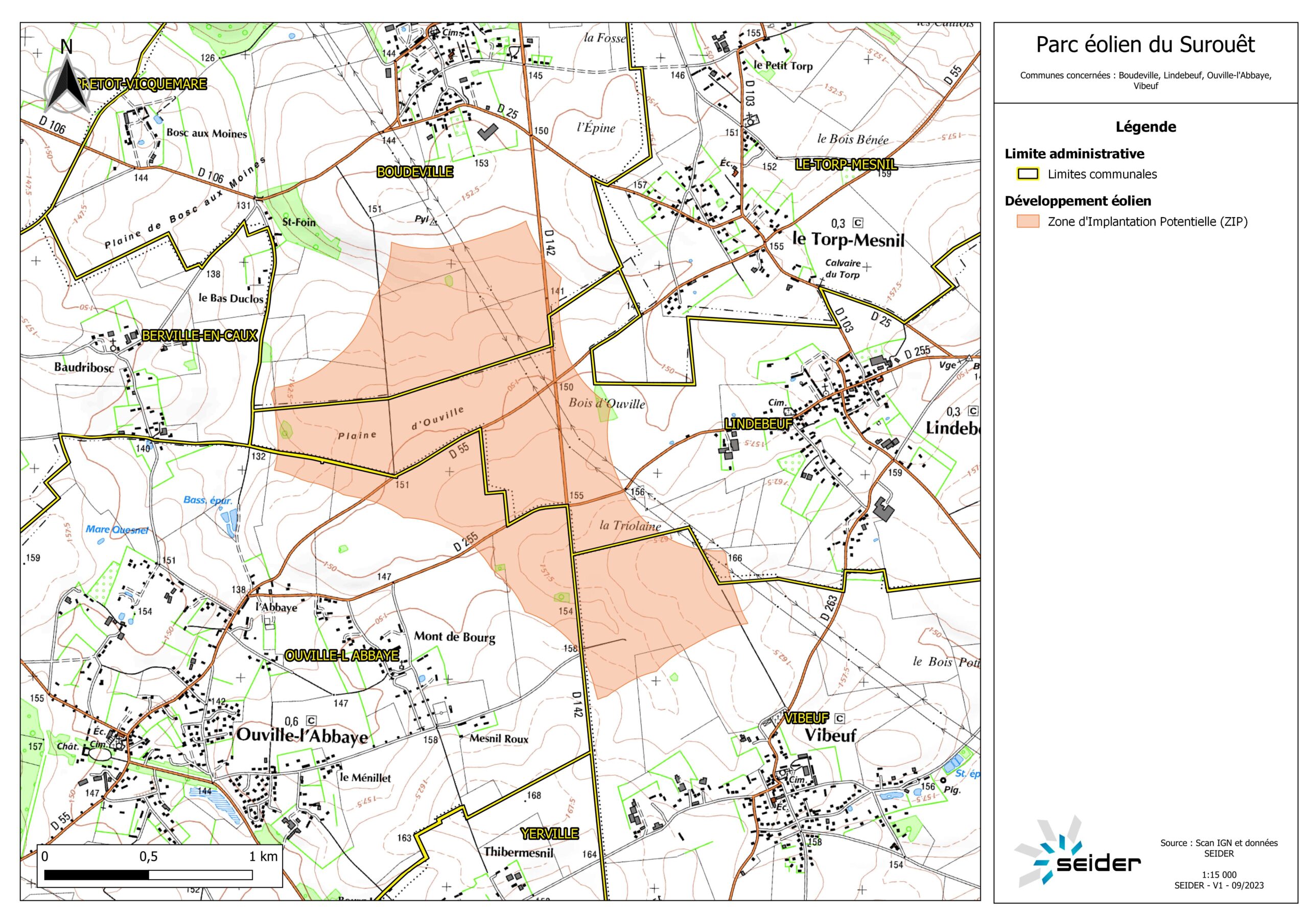 La Zone d’Implantation Potentielle (ZIP) du Parc éolien du Surouêt se situe sur le secteur des communes suivantes : Boudeville, Lindebeuf, Ouville l’Abbaye et Vibeuf, communes faisant partie de la Communauté de Communes Plateau de Caux-Doudeville-Yerville, dans le département de la Seine-Maritime (76), en région Normandie.